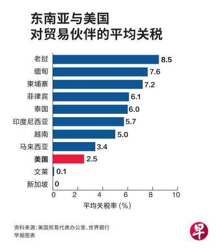 特朗普2月中宣布,要从4月2日起对所有贸易伙伴征收对等关税,将美国的进口税率调高至与贸易伙伴相等的水平。目前,东南亚仅新加坡和文莱的平均关税率低于美国,若美国以此为基准,再考量其他贸易壁垒,大部分东南亚国家难免遭受对等关税冲击。