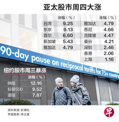 (华盛顿综合电)美国总统特朗普星期三突然宣布,刚在当天开始对数十贸易伙伴征收更高关税的措施暂停90天,连日剧烈波动的全球金融市场马上松了一口气,美国股市止跌回升,欧亚股市也强劲反弹。然而,特朗普唯独把中国排除在外,还把对华关税再提高到145%,而且立即生效,中美贸易战顿时白热化。
