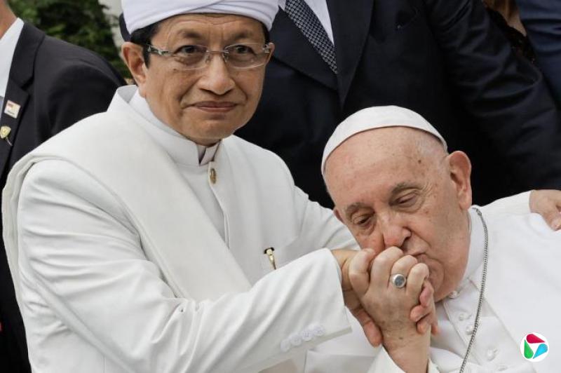 访问首站是全球回教徒人口最多的国家印度尼西亚,当时必须以轮椅代步的方济各与印尼回教大教长纳沙鲁丁签署了联合宣言,呼吁这两大宗教的信众,合作推动全球政治领袖,共同应对气候变化与极端主义威胁。彼此见面时,方济各亲吻纳沙鲁丁的手,纳沙鲁丁回吻方济各的头,亲切互动的新闻照片传遍世界,意义非凡。