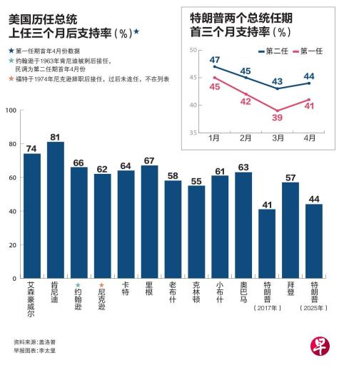盖洛普民调显示,特朗普的民意支持度从今年1月上任时的47%跌至4月的44%。不过,这个跌幅与他2017年第一次入主白宫时相近,特朗普当时的支持度同期从45%跌至41%。