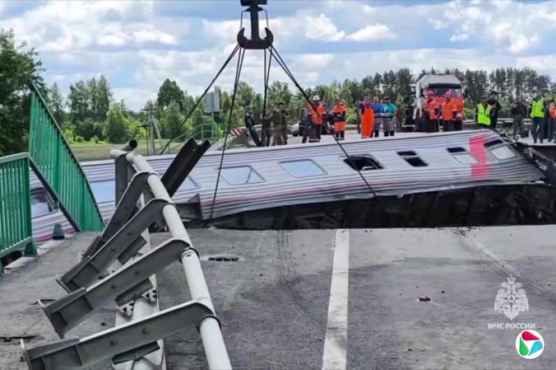 周六(5月31日)晚间于布良斯克地区(Bryansk),一座高速公路高架桥梁坍塌,压向底下的火车轨道,一列行经该处、载着388名乘客的列车撞上坍塌的桥梁后脱轨。事件造成七死69伤,死者包括一名列车驾驶员。