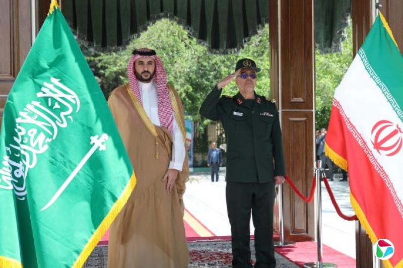 4月17日,沙特国防部长哈立德亲王(左)访问伊朗,伊朗武装部队总参谋长巴盖里(右)为他举行欢迎仪式。(路透社档案照片)
