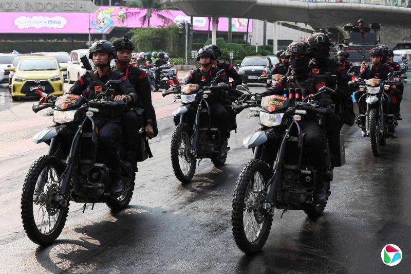 8月31日,印尼镇暴警察骑电单车在雅加达市中心巡逻。(路透社)