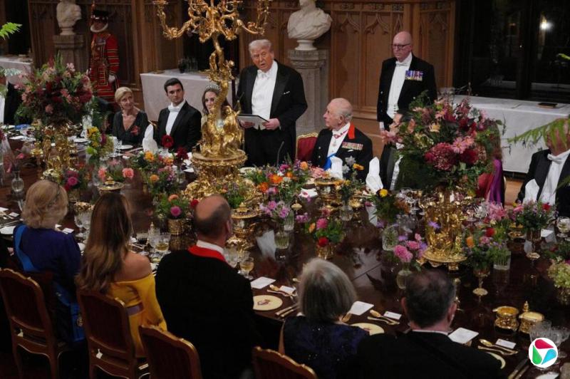 英国王室星期三晚间在温莎城堡以国宴款待美国总统特朗普,图为特朗普(站立着)在国宴上发表讲话。(路透社)