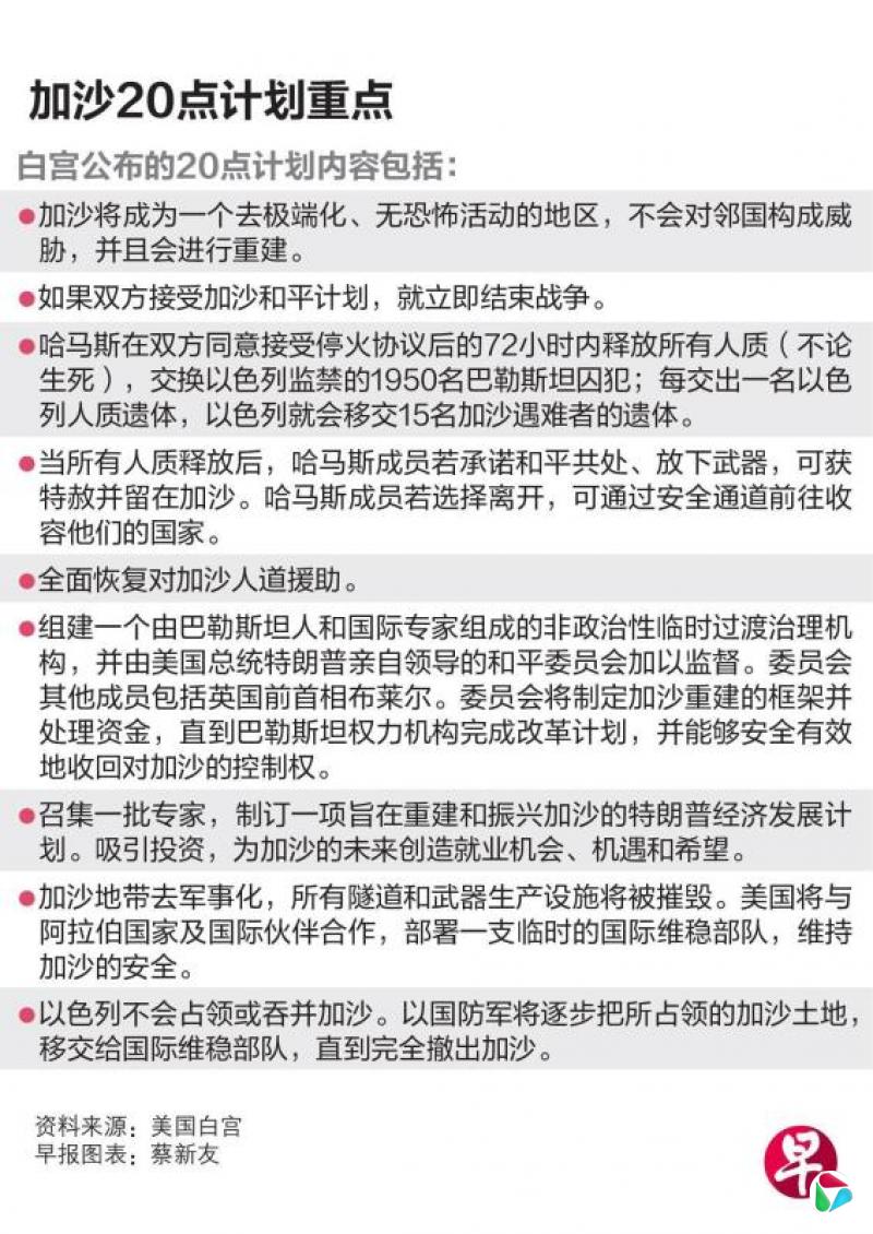 白宫公布的20点计划内容,包括哈马斯在双方同意接受停火协议后的72小时内释放所有人质,以交换以色列监禁的巴勒斯坦囚犯;全面恢复对加沙人道援助;组建一个由巴勒斯坦人和国际专家组成的非政治性临时过渡治理机构,并由特朗普亲自领导的和平委员会加以监督;加沙地带非军事化,并部署一支临时的国际稳定部队等。