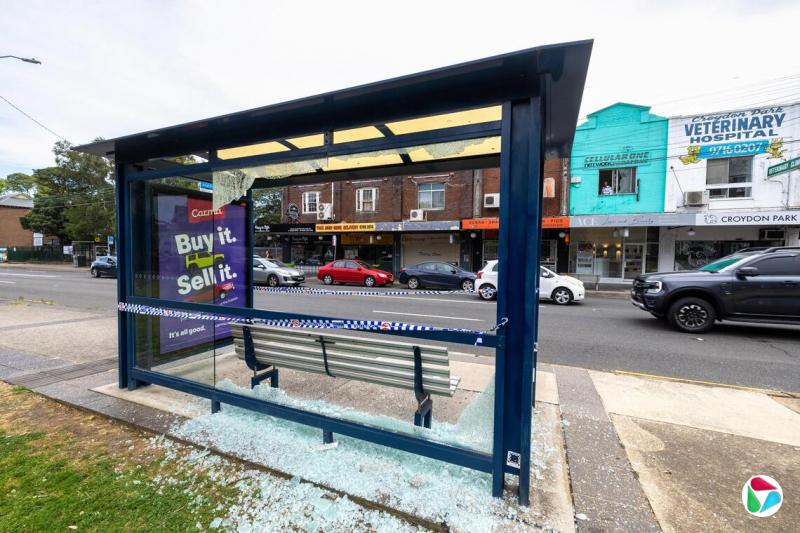 枪击事件发生在悉尼内西区克罗伊登公园,一个巴士站满地玻璃碎片。(路透社)