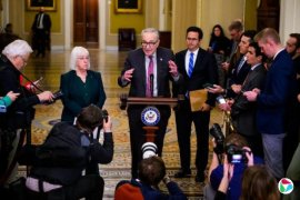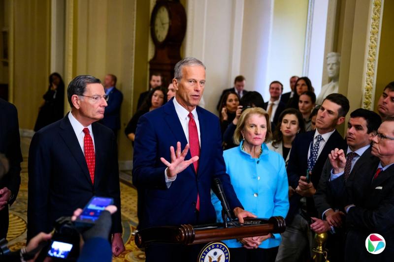 参议院4日投票前,共和党领袖图恩(中)在国会大厦说:“有些人意识到这种情况已经持续太久,给美国人民带来太多痛苦,是时候结束这一切了”。(彭博社)