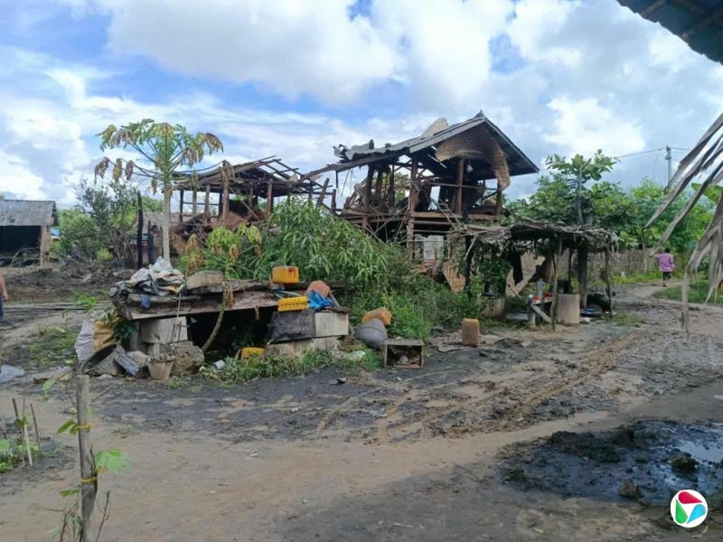 受访者欣欣提供的照片显示,缅甸马圭省的一个村子遭缅军投弹,村内几处民宅被炸并起火烧毁。(受访者提供)