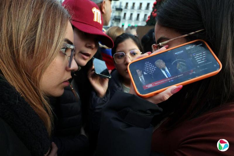 在西班牙,数千人聚集在马德里市中心的太阳门广场,观看特朗普举行的现场新闻发布会,并为此鼓掌。