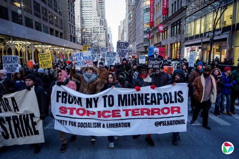纽约市民在1月20日特朗普上任一周年当天上街抗议,呼吁移民与海关执法局人员立即停止暴力执法。民调显示,多数美国民众都不认同执法人员使用武力。(彭博社)