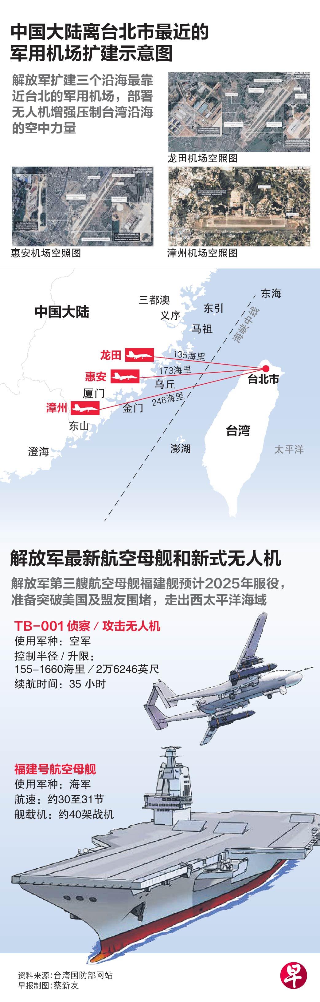 一是解放军扩建三个沿海最靠近台北的军用机场,常态部署无人机和新式军机,增强压制台湾沿海的空中力量,争取在战争时掌握台海空优。三个机场分别位于福建龙田、惠安和漳州,分别距离台北135海里(约250公里)、173海里(约320公里)和248海里(约459公里)。