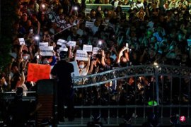 就在朝野拉锯时,立法院外晚上一度聚集了数以百计的绿营支持者,高喊“没有实质讨论、不是民主”等口号,抗议蓝白合作让法案过关,民进党立委也爬上铁门,和支持者喊话、齐唱《岛屿天光》等,场景令外界联想到10年前的太阳花学运。