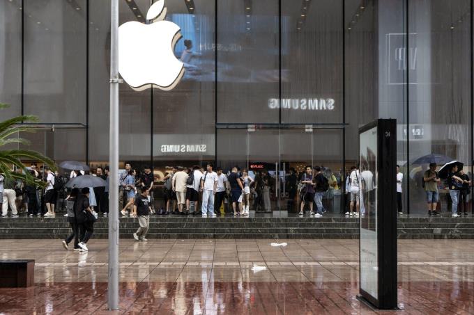 苹果最新推出的iPhone 16系列旗舰机星期五在中国上市,图为上海民众在苹果旗舰店外冒着雨排队。(彭博社)