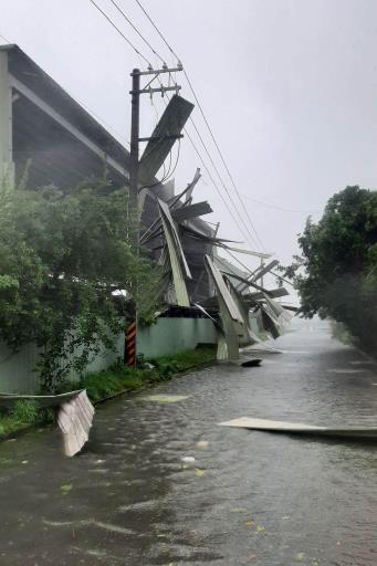 在台风山陀儿的强风吹袭下,高雄一处建筑物受损。(法新社)