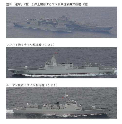 日本国防部通报从5月25日起,中国海军军舰辽宁舰(上右)、901型综合补给舰(上左)、南昌号导弹驱逐舰(中)、齐齐哈尔号导弹驱逐舰(下)持续在太平洋水域活动,期间进行数百次舰载机起降。(日本国防部统合幕僚监部)