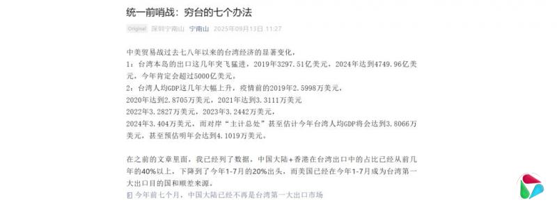 宁南山9月13日发布题为《统一前哨战:穷台的七个办法》的长文。文章首先称,中美贸易战过去七八年来,台湾经济发生显著变化。例如,台湾出口突飞猛进,从2019年的3297.51亿美元增至2024年的4749.96亿美元,“今年肯定会超过5000亿美元”。同时,台湾人均GDP大幅上升,从2019年的2万5998美元,预估明年会达到4万1019美元。
