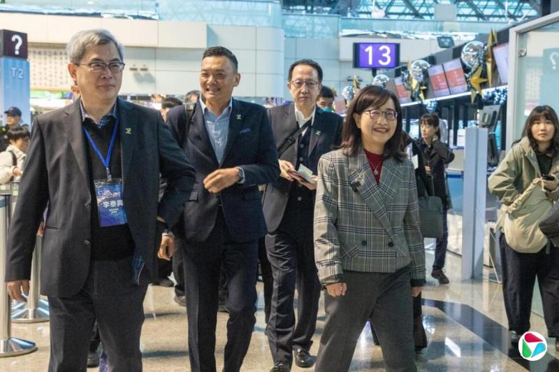 双城论坛本周末在上海举行,由台北副市长林奕华(前排右一)率领的代表团星期六(12月27日)从桃园机场出发前往上海。(香港中通社)