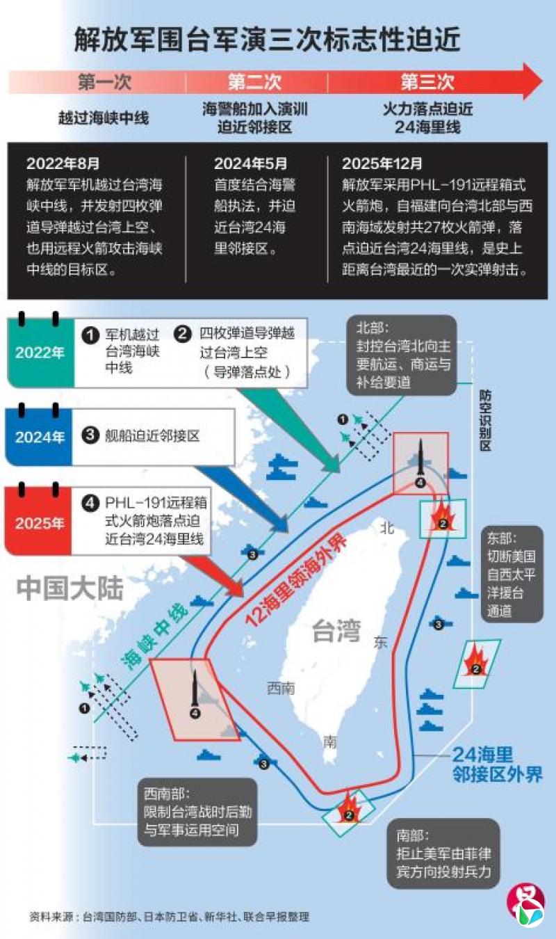 仔细比较过去三年来历次围台军演可以发现,北京的军力投射已由2022年8月突破台湾海峡中线,到2024年5月首度加入海警船演训并迫近台湾24海里邻接区;2025年底再由实弹迫近到台湾24海里的邻接区。