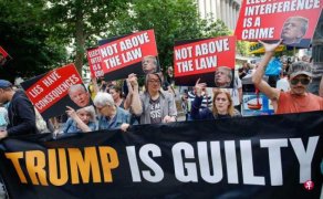 美国纽约一陪审团裁定前总统特朗普在封口费案面对的34项罪名全部成立后,特朗普一走出曼哈顿刑事法院就说,真正的判决将在11月总统选举投票日揭晓。