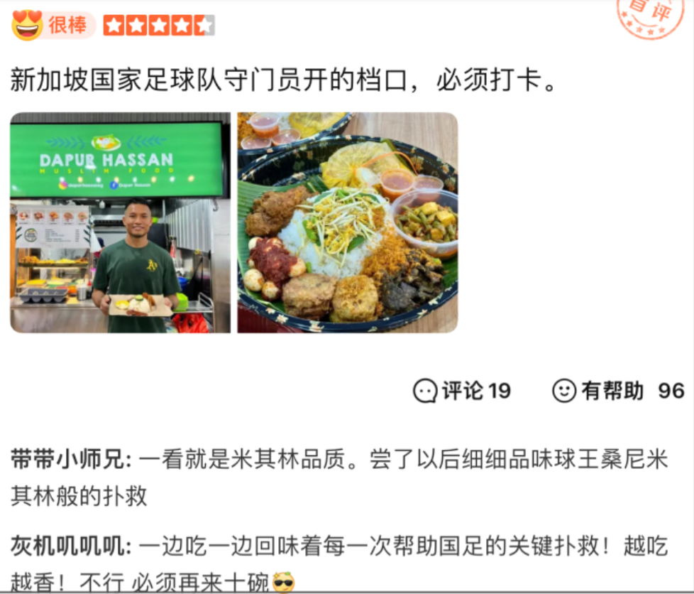 新加坡门将哈山·桑尼(Hassan Sunny)在世界杯预选赛对阵泰国时的出色表现,间接帮助同组的中国男足“起死回生”入围18强。这场比赛也让哈山在中国互联网出圈,他名下的小吃店更引来不少球迷爆买。