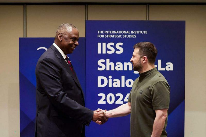 乌克兰总统泽连斯基(右)于6月2日在新加坡香格里拉对话会前与美国国防部长奥斯汀握手。(法新社)