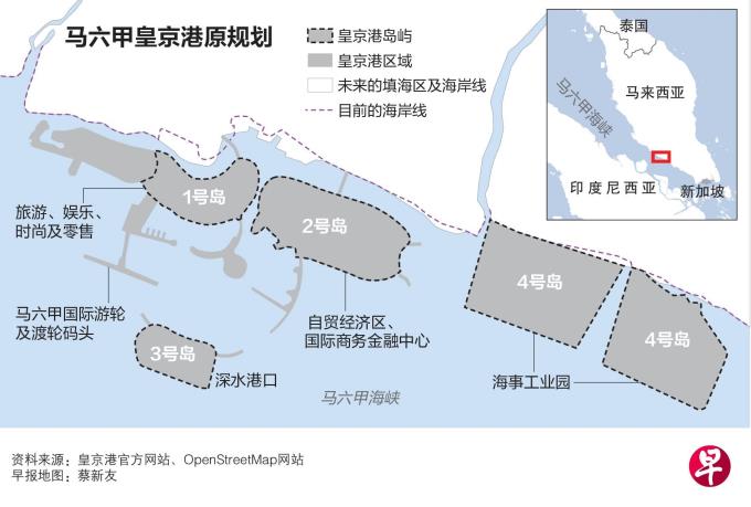 整个皇京港项目原定2025年完成。不过,《联合早报》采访队8月中到马六甲实地了解情况时,发现皇京港的入口处封闭,唯一填海造出的1号岛依然空荡荡,不见任何工程。
