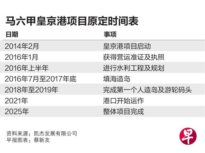去年9月,凯杰宣布获得联邦政府及州政府的支持重启皇京港项目,并将引入新的投资者、股东和领导层。不过,项目规模大为缩减,只兴建一座国际游轮码头。