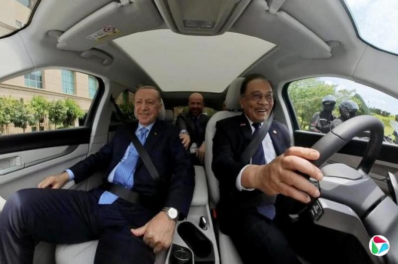 土耳其总统埃尔多安(左)星期二(2月11日)将一辆Togg T10X土耳其国产电动车赠送给马来西亚首相安华(右),象征两国之间的深远友谊。安华随后亲自驾驶这辆电动车,载着埃尔多安出席活动。(取自安华脸书)