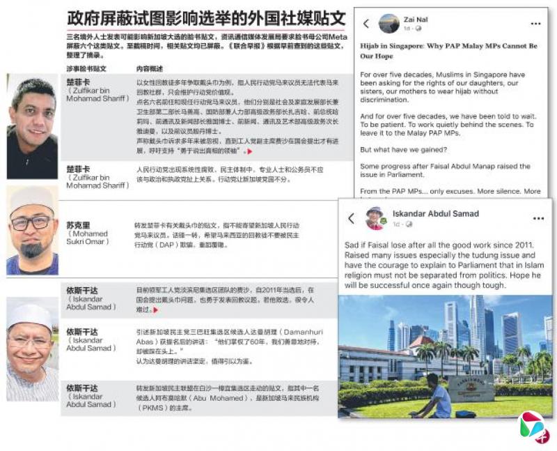 马来西亚政治人物和新加坡前公民等境外人士发表可能影响新加坡大选候选人选情的贴文,资讯通信媒体发展局(IMDA)已要求脸书母公司Meta在本地屏蔽这些贴文。也有本地人在网上以民族和宗教课题,鼓动选民支持某些候选人。