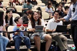 关颖恩从今年8月起,每周都到南洋理工大学上三天的化学基础讲堂课。小小的身影,坐在可容纳数百人的大讲堂第一排,相映成趣。(档案照片/南洋理工大学)