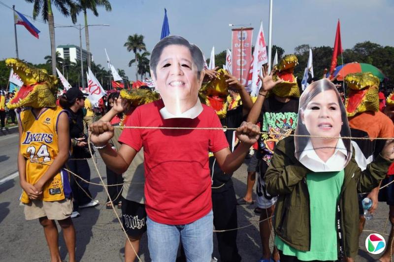 另一群示威者聚集在距离总统府不远的黎刹公园。他们抬着巨大的双头鳄鱼模型,分别代表小马可斯和他的主要政治对手、副总统莎拉,象征着政府腐败。一些示威者举着鳄鱼形状的标语,呼吁结束系统性贪污。