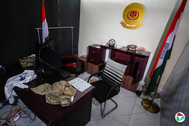 园区内有多个工作间,桌面上摆放着成排的电脑,散落着指导如何诈骗泰国受害者的文件。此外,园区内还有用于拨打电话的录音隔间,以及伪装成印度警察局的房间。