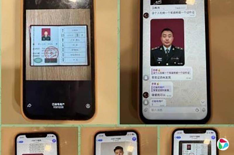 此外,执法人员在电子设备中发现大量伪造军人证和照片,以及聊天记录截图。这些资料显示,犯罪团伙通过社交平台分工协作,从假证件制作、提供身份信息到诈骗话术指导,形成分工明确的流水线式诈骗手法。