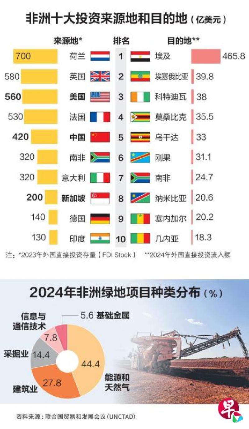 2023年,美国是非洲第三大FDI存量来源国,中国是第五大、新加坡第八大。