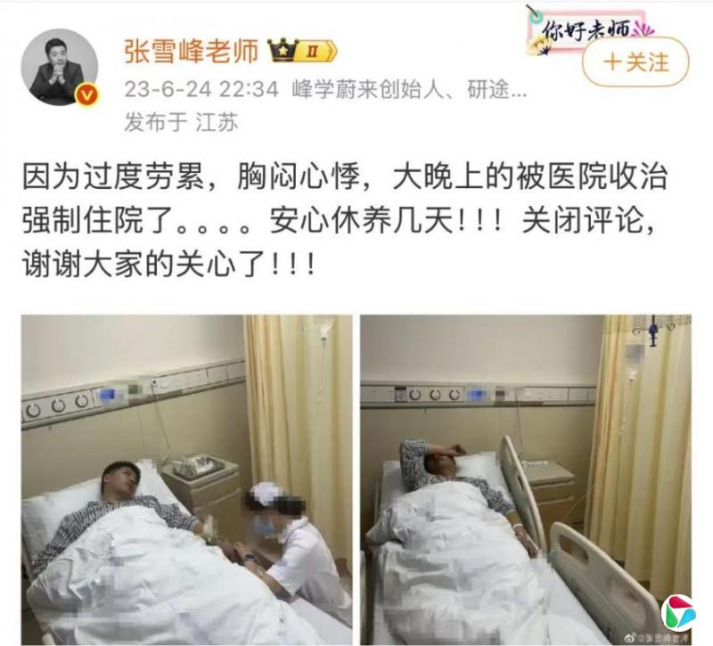 张雪峰的健康状况早就亮起过红灯。2023年6月24日,高考成绩公布后第三天,他就发了条微博,称自己因“过度劳累、胸闷心悸”,被医院收治强制住院。
