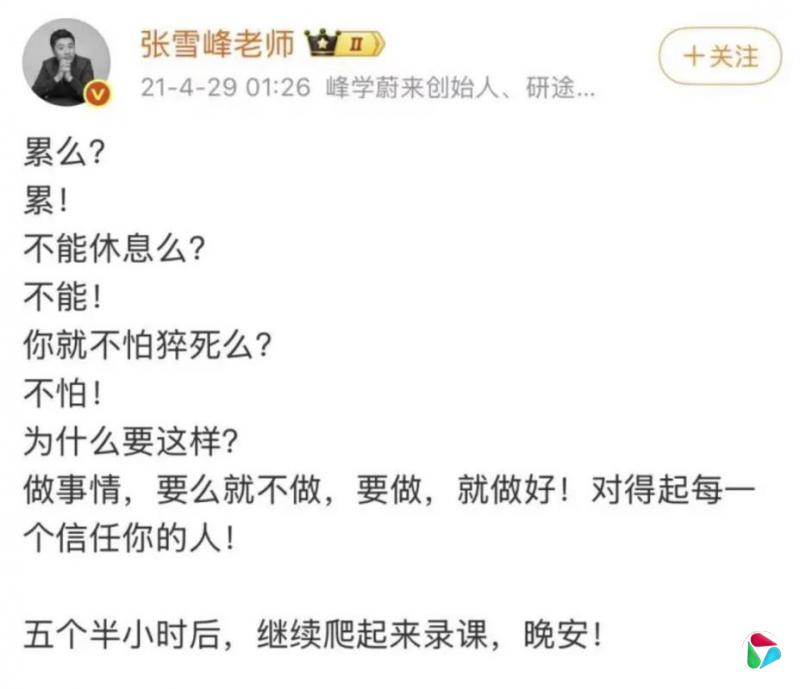 2021年4月,他又在凌晨1时过后发帖:“累么?累!不能休息么?不能!你就不怕猝死么?不怕!为什么要这样?做事情,要么就不做,要做,就做好!对得起每一个信任你的人!五个半小时后,继续爬起来录课,晚安!”