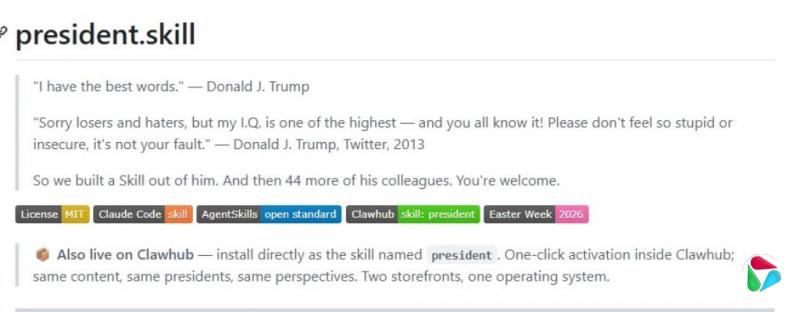许多外国工程师也加入这股热潮。ClawIndustry的创始人Louie Prinz在社媒X上说,出现了这么多技能,为什么没人为塑造历史的人开发技能呢?于是,他开发了总统skill,“包括美国总统特朗普和他的44位同事。不用谢。”