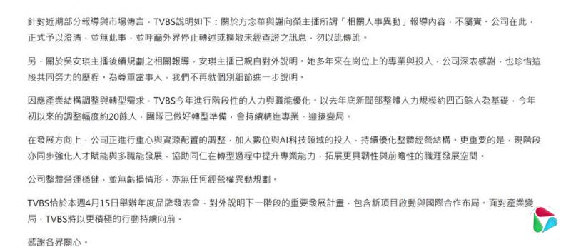 几乎同一时间,TVBS内部也传出裁员消息,资深主播谢向荣、吴安琪、方念华等人都在网传裁员名单上。其中,吴安琪已向媒体证实她被裁员的消息。