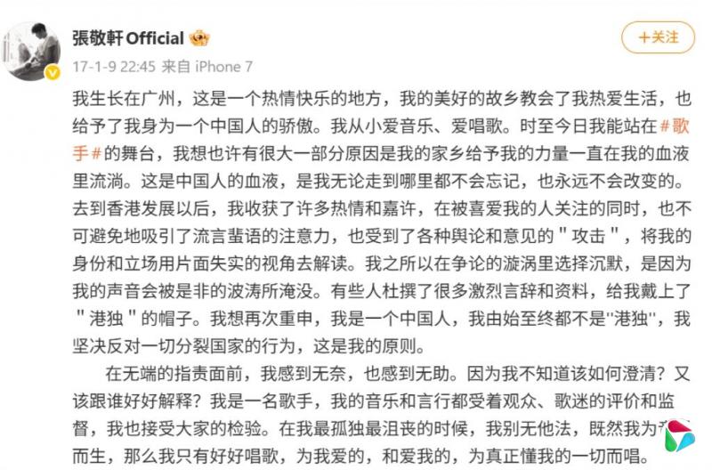 尽管如此,他最终仍退出节目,已录制内容也被删除。当时,《解放军报》旗下《中国国防报》曾刊文点名批评张敬轩被网民扒掉“外衣”,揭发他声称爱国,但其实支持“港独”及“台独”。文章还说:“国家面前无偶像,任何想要分裂祖国的艺人都应被抛弃。”