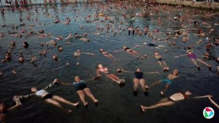 2月8日,湖水盐度为每升120克,湖中的1837人同时仰卧漂浮在水面上达三分钟。奇基塔湖在湿润年份的平均盐度约为每升35克,但水位下降时,盐度可高达每升250克。(法新社)