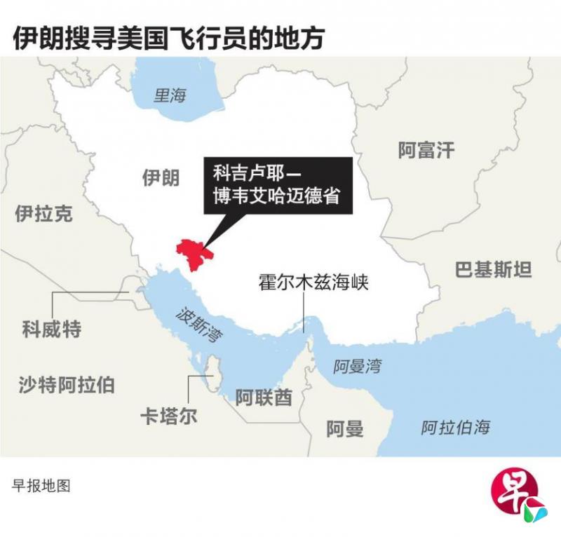 伊朗方面也在全力搜捕这名飞行员。伊朗官员说,伊斯兰革命卫队已封锁西南部科吉卢耶—博韦艾哈迈德省(Kohgiluyeh and Boyer-Ahmad)一带,伊方认为这是飞机坠落的地方。