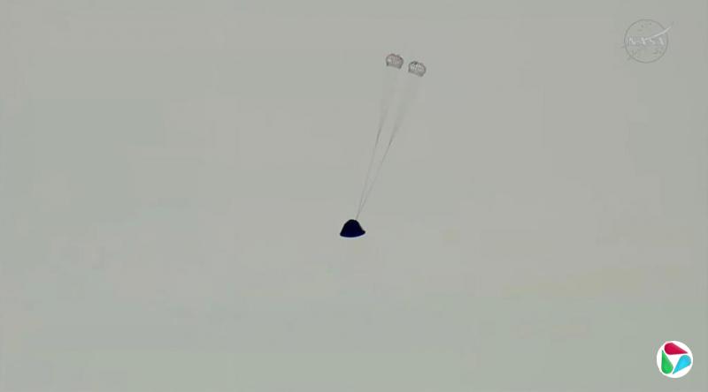返回舱的第一组降落伞打开,这一组减速伞主要确保返回舱稳定和减速。(路透社)