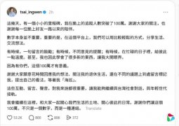 蔡英文最后在贴文写道,她会继续在这里,和民众一起关心生活的土地、关心彼此的日常。“谢谢你们让这个100万,不只是一个数字,而是一种连结。”
